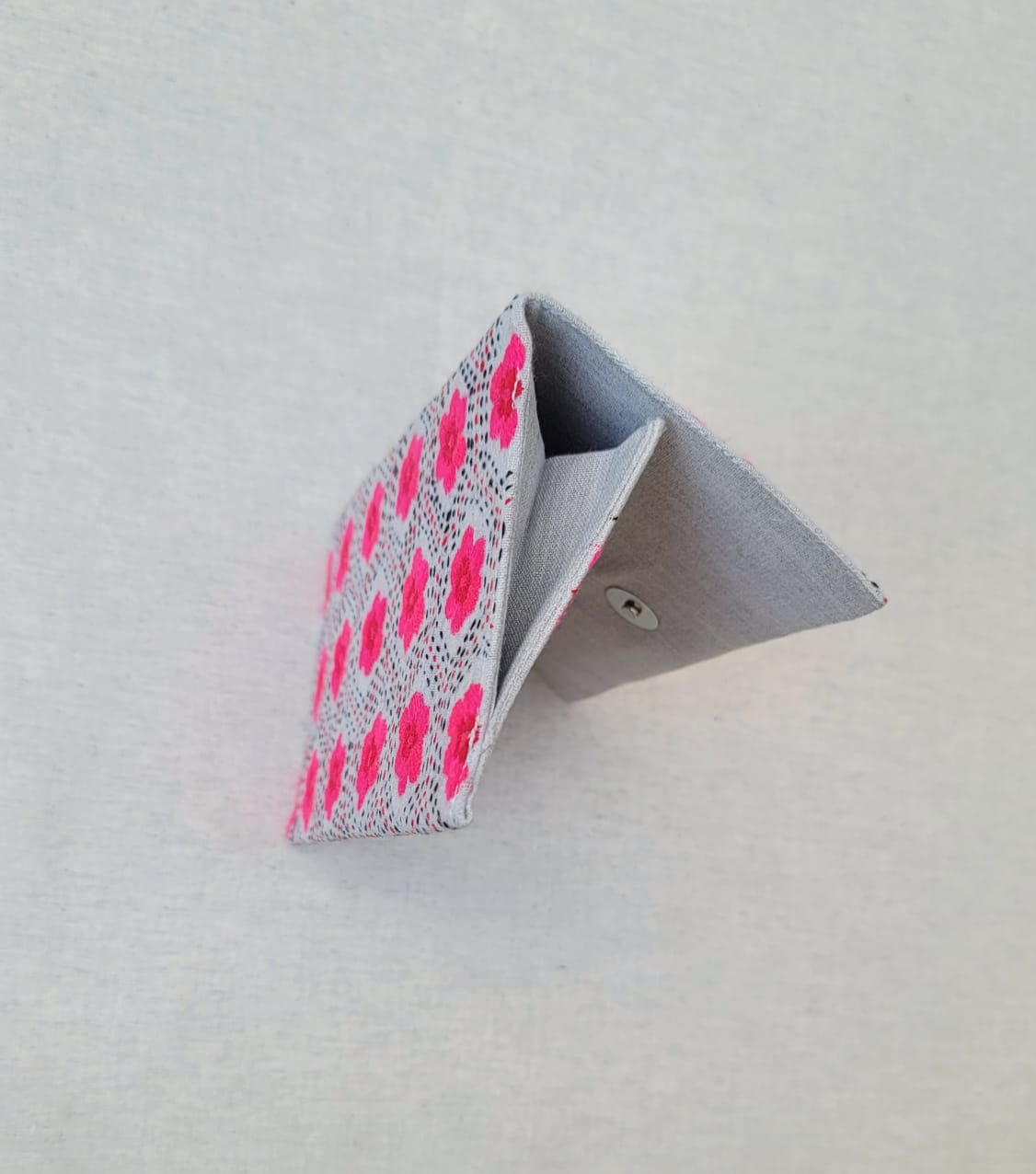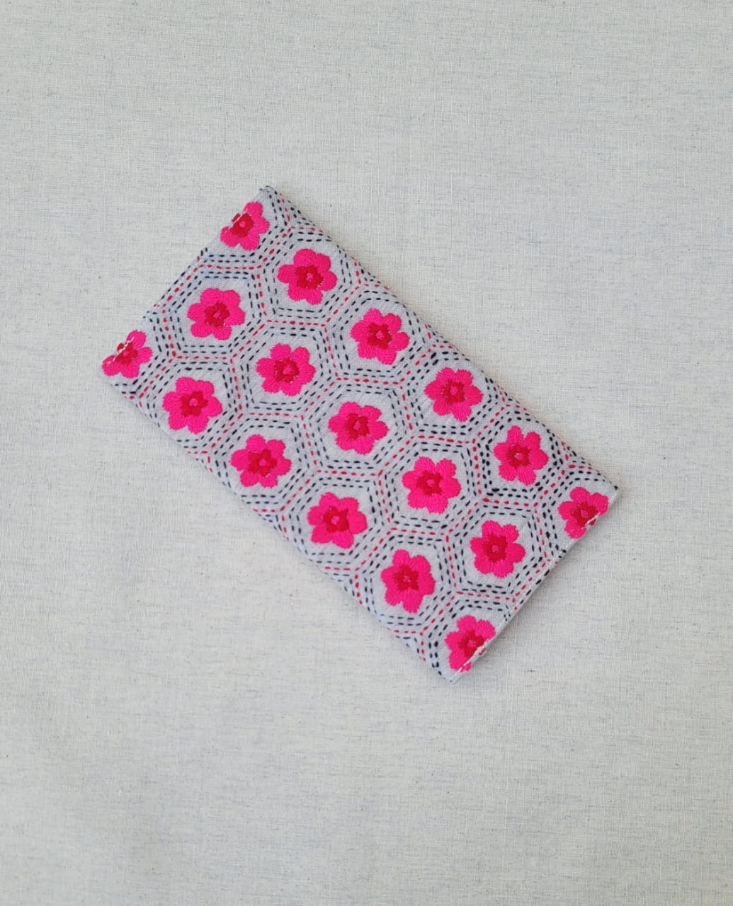 This beautifully handcrafted wallet features radiant pink floral embroidery over a soft grey fabric, exuding sophistication and charm. It reflects the essence of modern femininity while embracing the heritage of Pakistani embroidery traditions. The Neon Nest Wallet is not just an accessory but a statement of taste and culture.